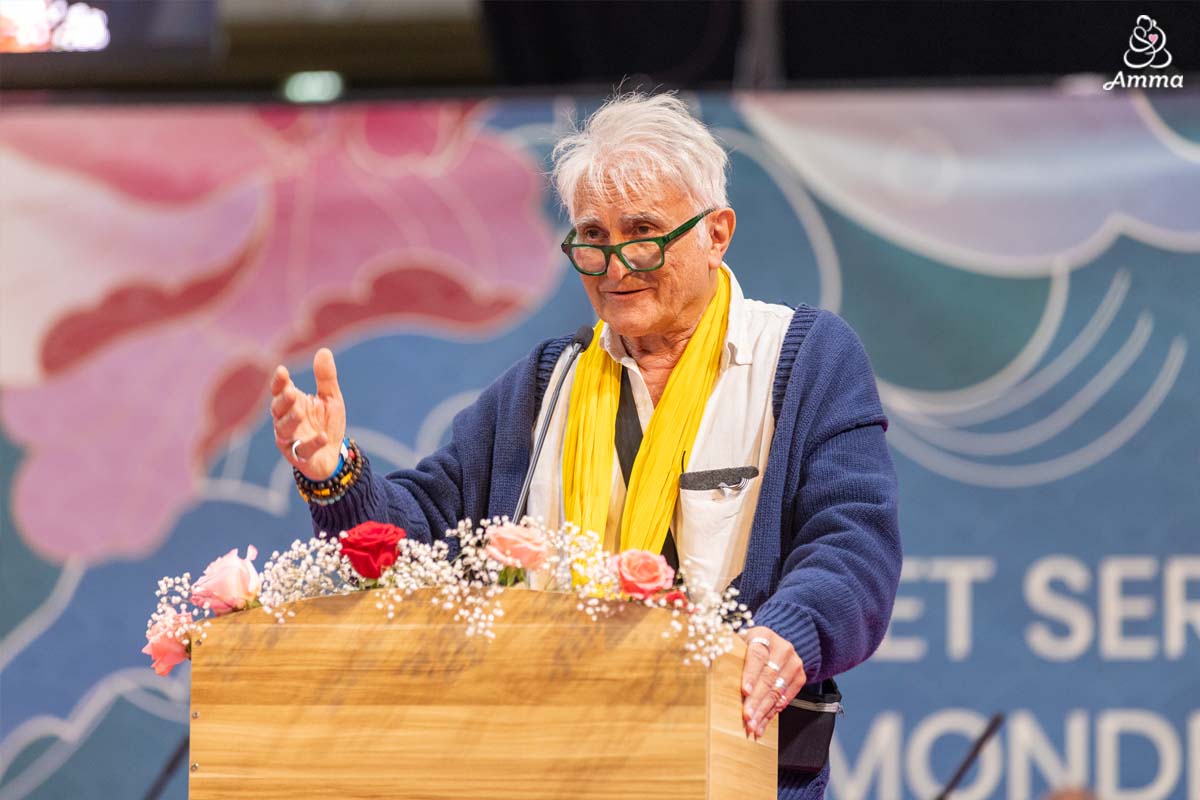 Celebrated author Pierre Lunel released his second book about Amma. In his address, he joyfully shared, “When I dug into the wonders of Amma’s teachings, I found a diamond. That precious gem of her words is, ‘If you want to change the world, start by changing yourself.’”