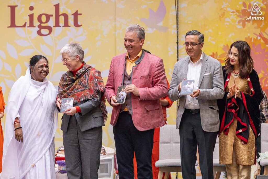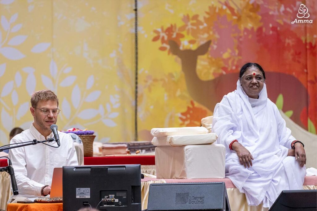 Also reflecting Amma’s vision came the words of Andreas Hirsch, one of the founders of AYUDH Europe, a chapter of our youth movement that began in 2005. By her side, he delivered an address about how Amma leads all of us to see the light that shines eternally within.