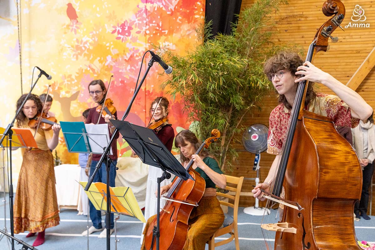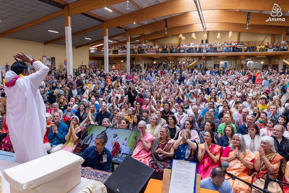 Throughout the three days, Amma led satsang, bhajans, a guided meditation, and Atma Puja for world peace, offering solace and strength to all who attended. She also sang a German bhajan, filling the hall with emotion as many sang along through tears.