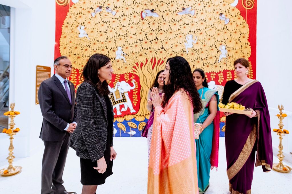 The Ambassador of India, His Excellency Sanjeev Singla, welcomed the guest of honor, Ms. Éléonore Caroit, Minister Delegate to the Minister for Europe and Foreign Affairs. Among the guests were the center’s director, Ms. K. Nandini Singla; Ambassador Vishal Sharma, India’s Permanent Delegate to UNESCO; as well as representatives from the arts, media, business, and fashion sectors.