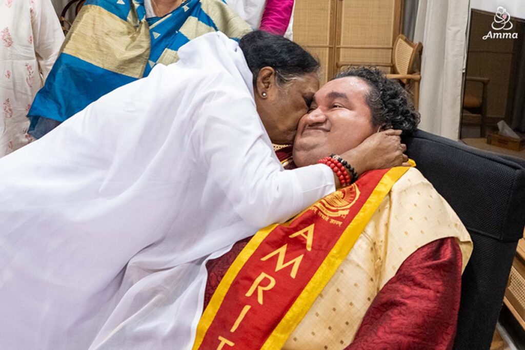Late in the night, after darshan had concluded, Amma met an inspiring man whose life itself is a message of courage, resilience, and joy. At around 11:15 pm, Amma lovingly received Sai Kaustuv Dasgupta, a 37-year-old from Bengal, who had come to Amritapuri along with his parents.