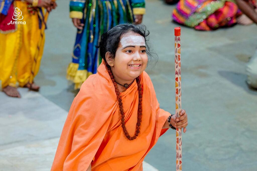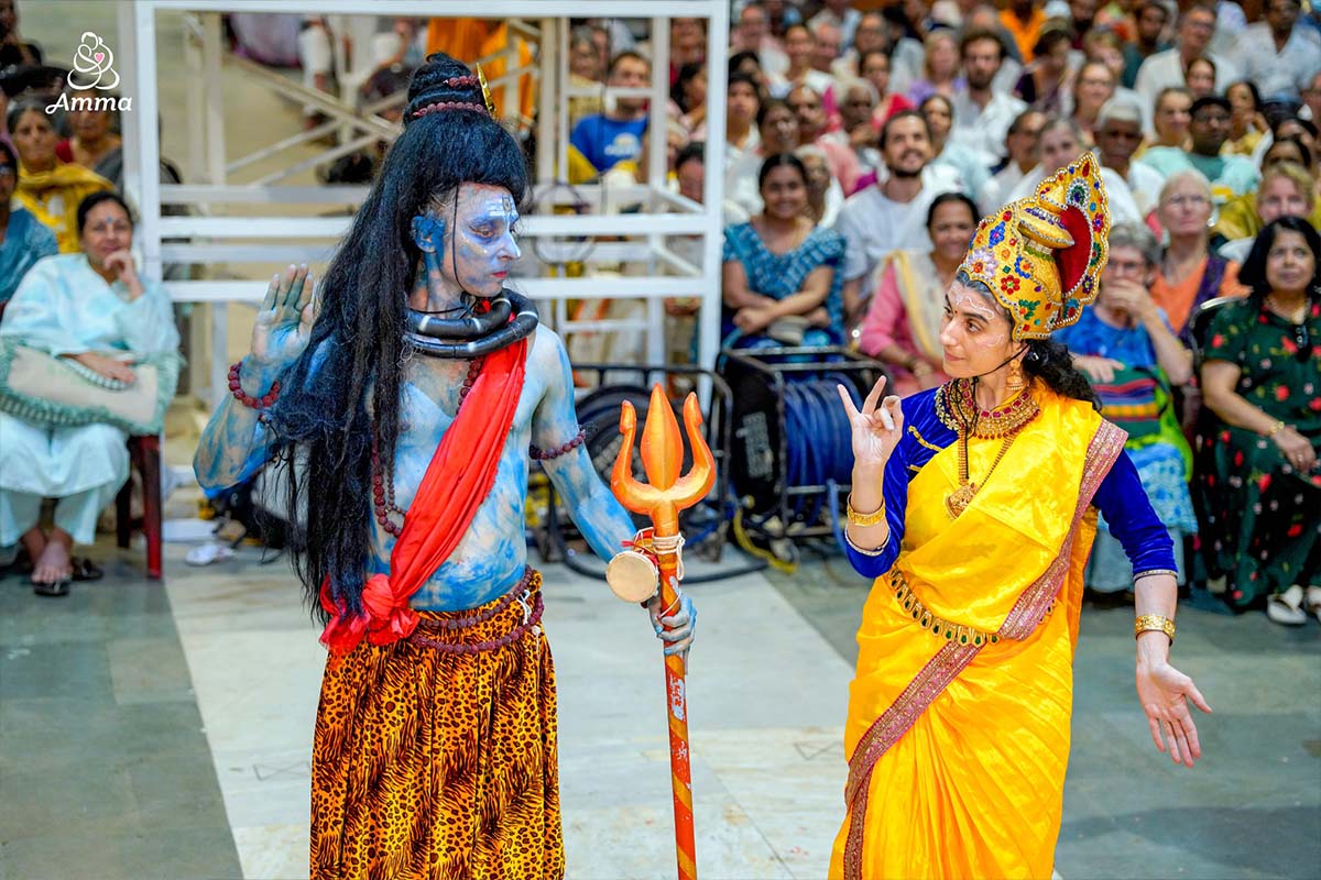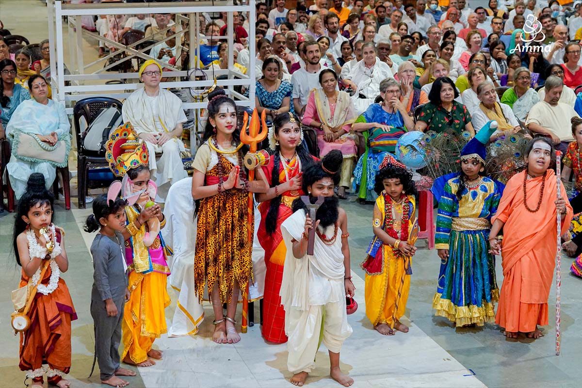 But as is her way, Amma inspires happiness as a key element to self-sacrifice. Shivaratri became a night of celebration for the eternal beauty that exists in all. Amidst this collective worship, the Ashram youth performed bhajans set to modern music, including guitar, and the children dressed in intricate costumes to share Shiva’s legends.