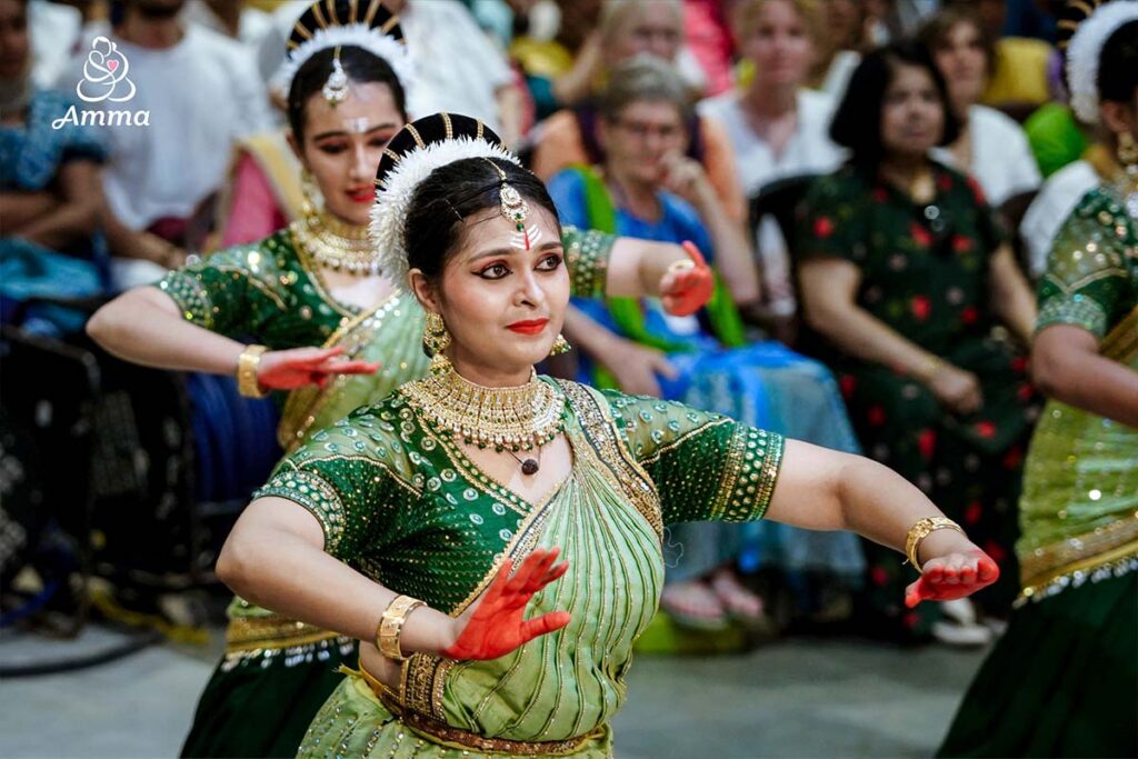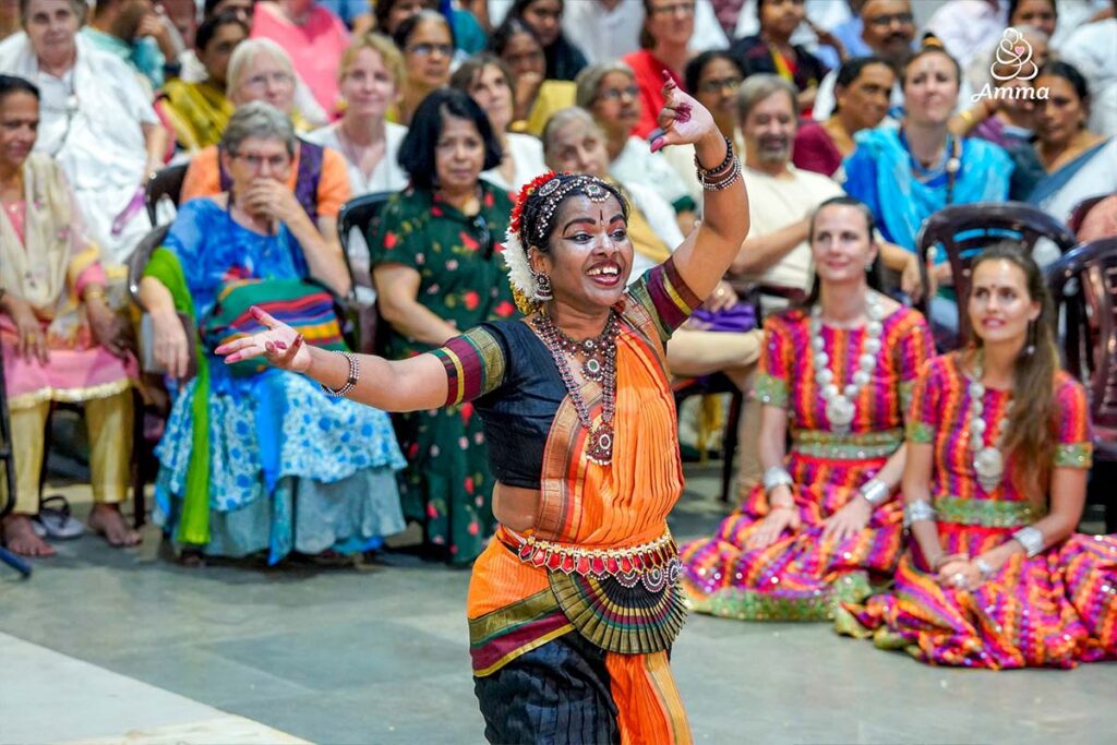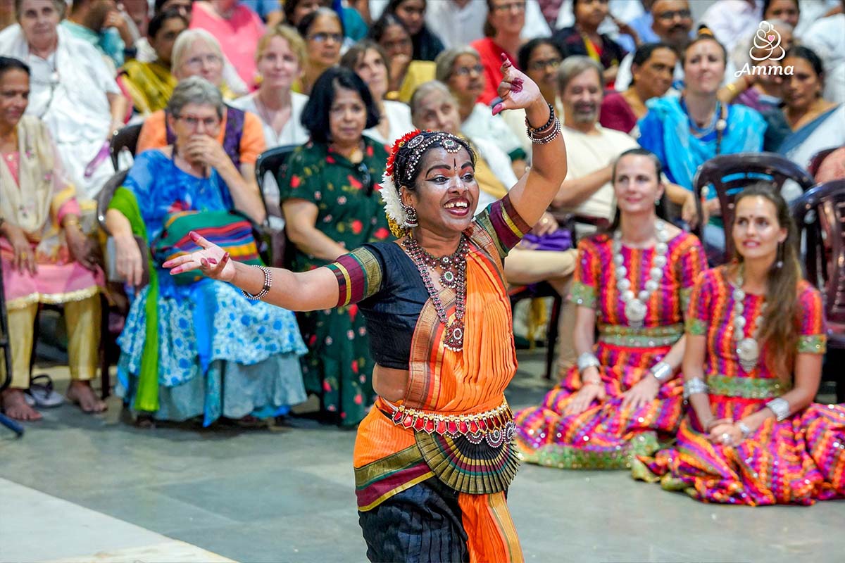Deeply moved, Amma spontaneously rose to dance, as well, awakening an indescribable moment of divine bliss in everyone watching. Why? Because that is the depth of her compassion—to bring all hearts and all minds together in a world of universal peace and selfless love.